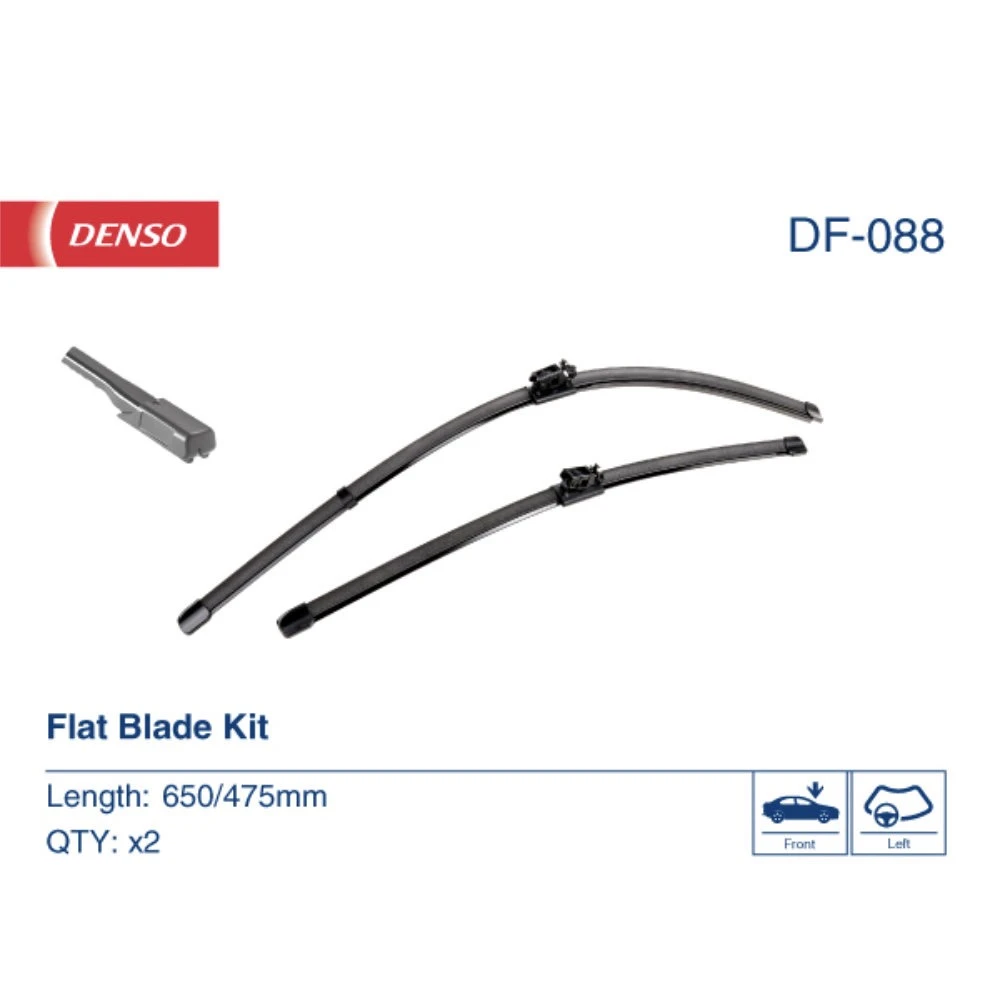 Vorne Scheibenwischer Denso Flat DF-088 (Vorne, 2 Wischblätter) für Mercedes EQA H243 SUV (2020, 2021, 2022, 2023, 2024, 2025). Hersteller: Denso. Länge: Fahrerseite - 650 mm, Beifahrerseite - 475 mm. Inhalt: 2 Wischblätter. Einbauposition: Vorne.