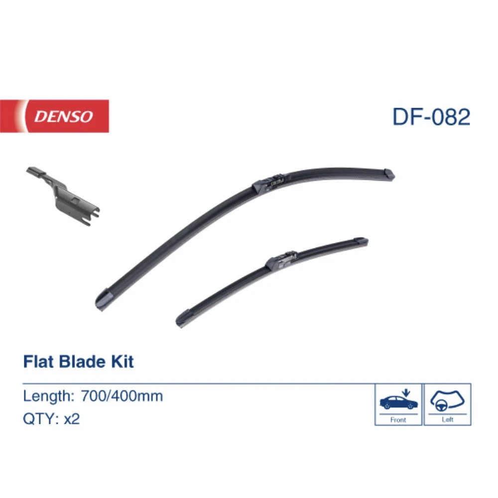 Vorne Scheibenwischer Denso Flat DF-082 (Vorne, 2 Wischblätter) für Toyota Prius 4 W50 W52 Limousine (2015, 2016, 2017, 2018, 2019, 2020, 2021, 2022). Hersteller: Denso. Länge: Fahrerseite - 700 mm, Beifahrerseite - 400 mm. Inhalt: 2 Wischblätter. Einbauposition: Vorne.