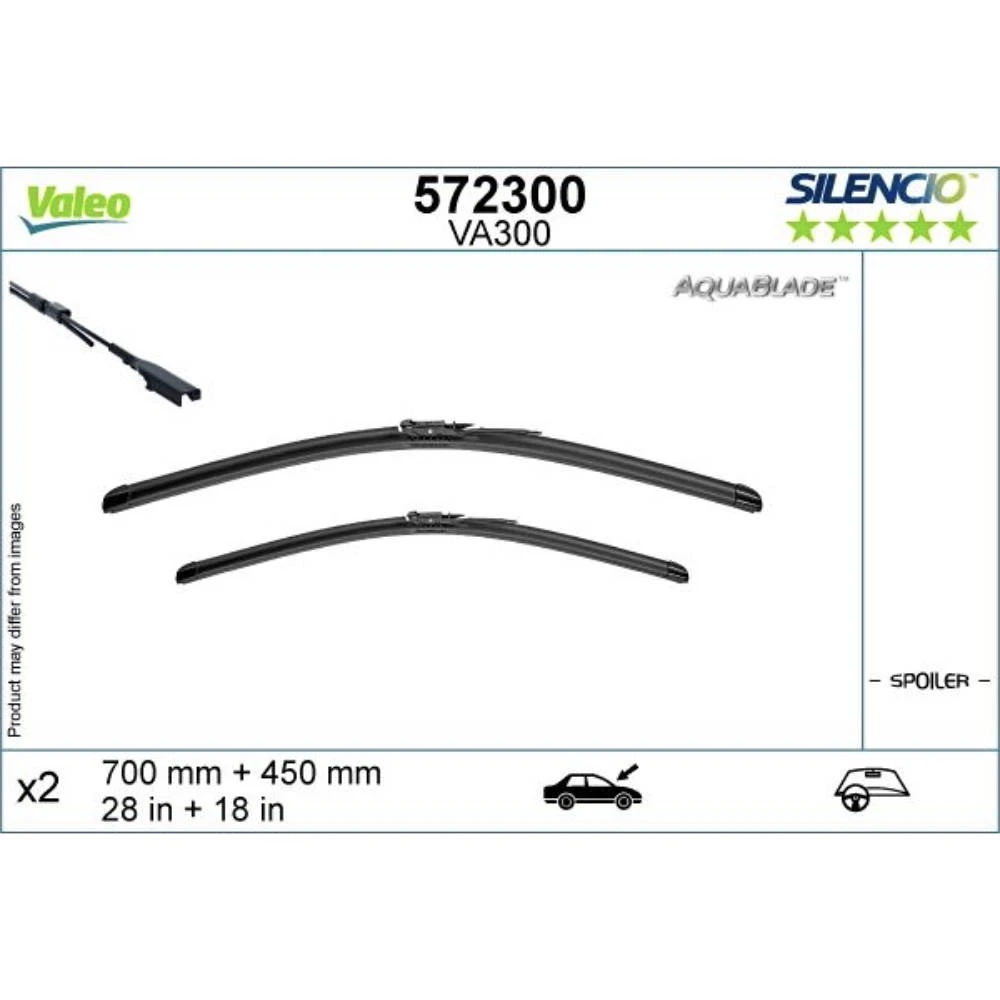 Vorne Scheibenwischer Valeo Aqua Blade VA300 (Vorne, 2 Wischblätter) für Tesla Model X SUV mit Dusen am Wischerblatt (2014, 2015, 2016, 2017, 2018, 2019, 2020). Hersteller: Valeo. Länge: Fahrerseite - 700 mm, Beifahrerseite - 450 mm. Inhalt: 2 Wischblätter. Einbauposition: Vorne.